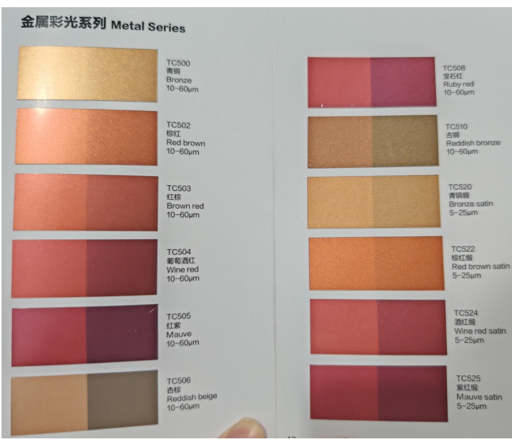 A série metálica é revestida com metano na superfície da mica. Ao controlar com precisão a espessura do revestimento de óxido férrico, surgem sucessivamente uma série de tons de bronze, marrom avermelhado, bordô, roxo, vermelho, verde e café. A tonalidade e o cromatograma são completos, metálicos fortes, com forte poder de cobertura, cor rica e propriedades físicas e químicas.
