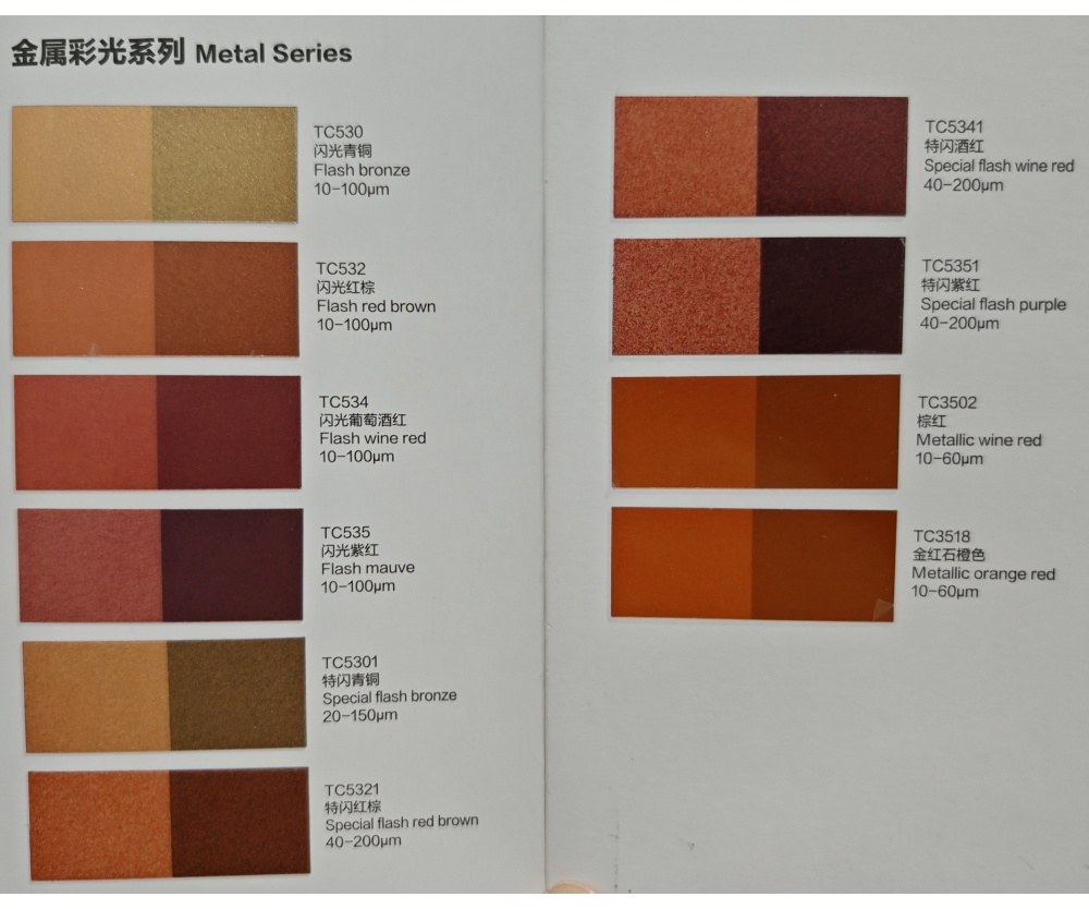 A série metálica é revestida com metano na superfície da mica. Ao controlar com precisão a espessura do revestimento de óxido férrico, surgem sucessivamente uma série de tons de bronze, marrom avermelhado, bordô, roxo, vermelho, verde e café. A tonalidade e o cromatograma são completos, metálicos fortes, com forte poder de cobertura, cor rica e propriedades físicas e químicas.